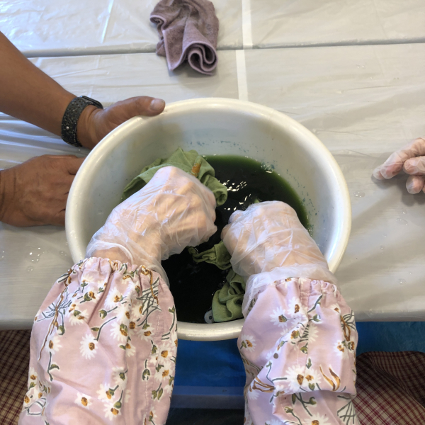 初めて藍染をされる方も多かったようですが、巾着袋に柄が浮かぶ様に各自思い思いの細工を施し、しっかりと染料を揉みこんで、個性あふれる色合いと模様が完成しました。
