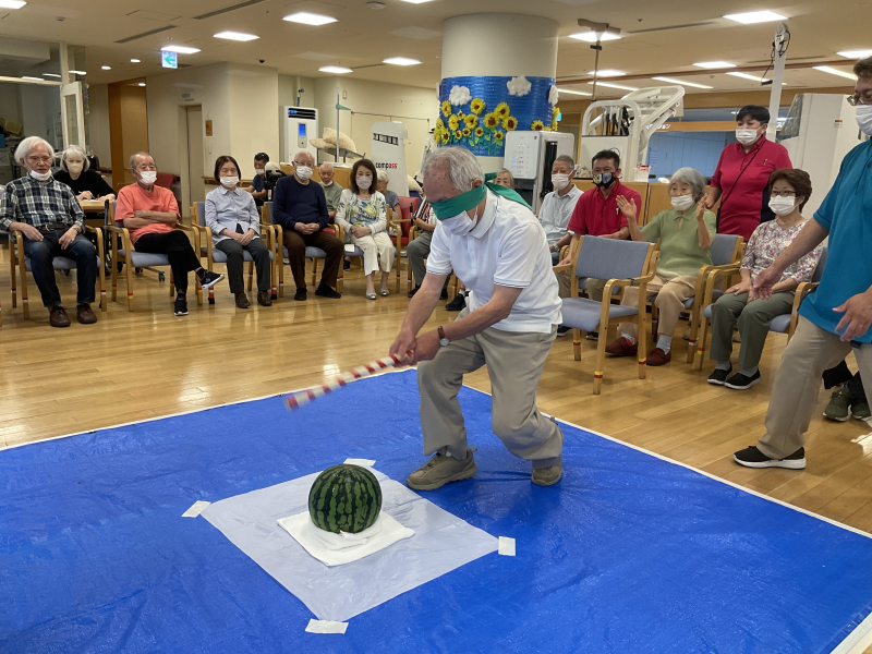 目隠しをして棒を持ち、周りの声援を頼りに「右!もう少し前!」と声を掛け合いながら挑戦!利用者の皆さまの笑い声と拍手で、会場は大いに盛り上がりました。