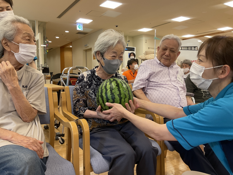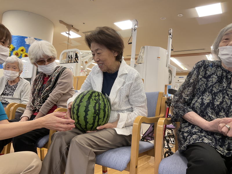 さらに今回は、皆さんでスイカを持ち上げて「何キロあるかな?」と重さを当てるゲームも。「意外と重いね」「昔はよく持ったよ」などの声も聞かれ、昔話に花が咲きました。