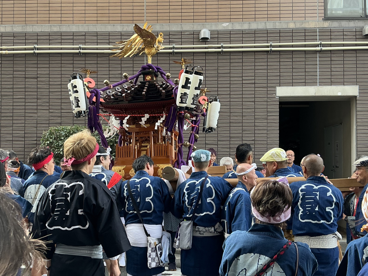 地域の四五睦会(北沢4・5丁目)の皆さまが、北澤八幡宮例大祭のお神輿を担いで来てくださいました。