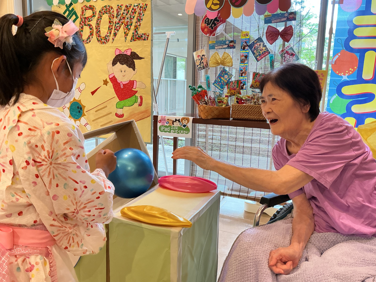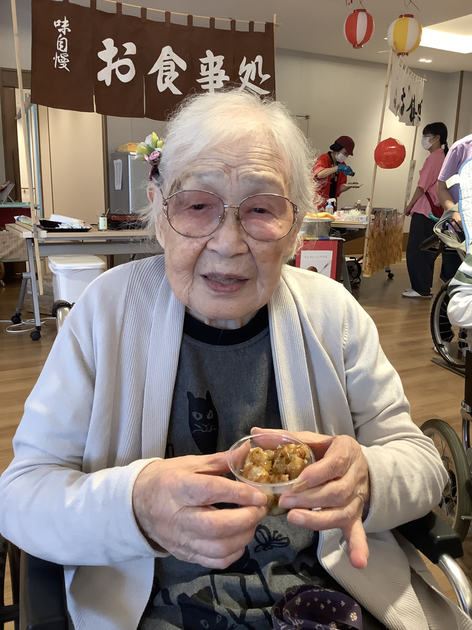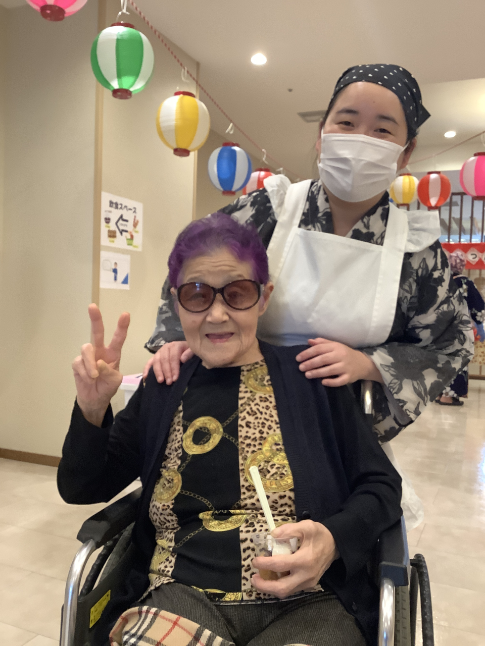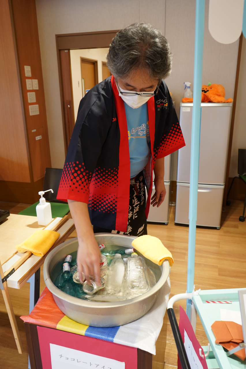 昨年同様、各ユニットよりブースを出店し1階フロアは縁日ストリートと屋台コーナーでお祭り会場に変身。ご利用者が非日常のひと時を楽しく笑顔になるようにと職員がアイデアを出し合い尽力した結果、60件106名のご家族も参加され盛大に開催することが出来ました。