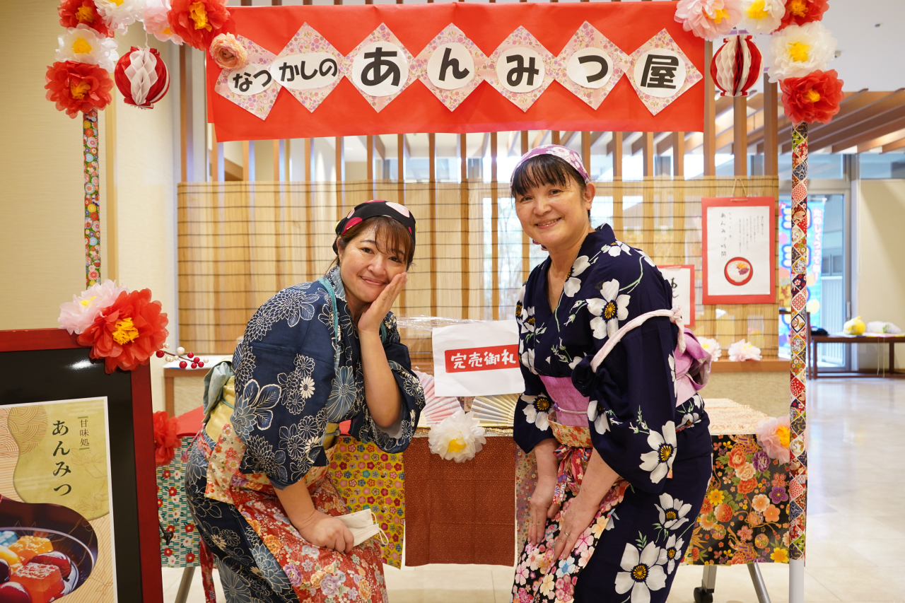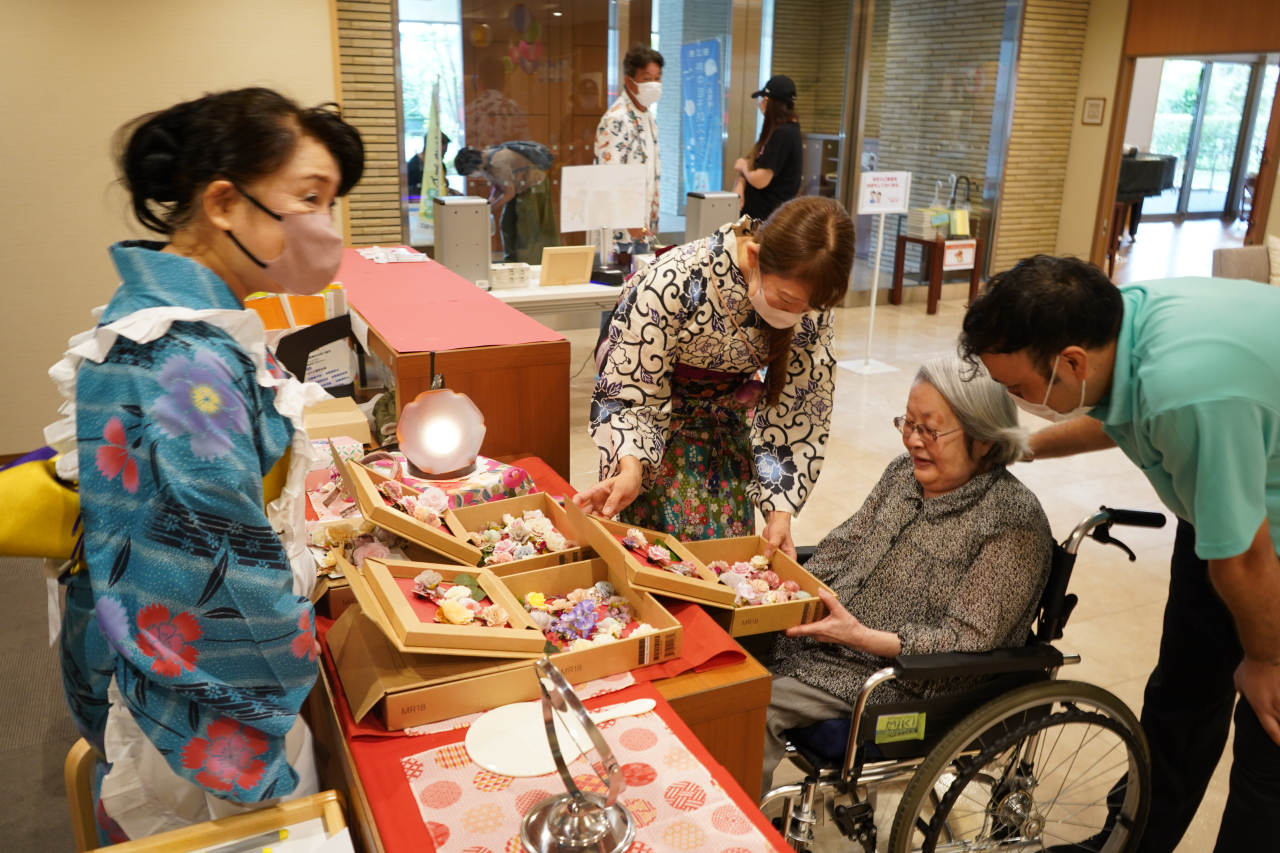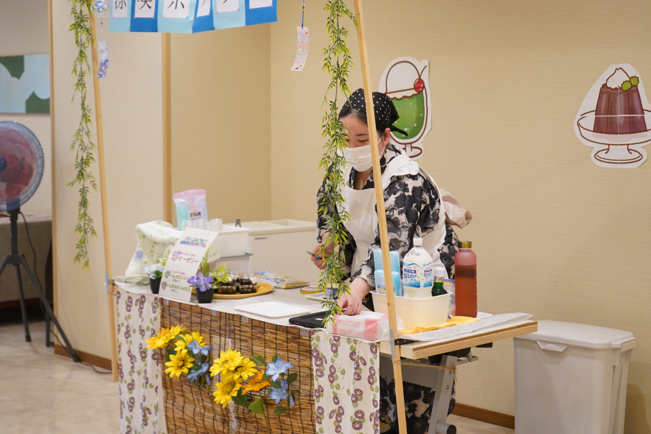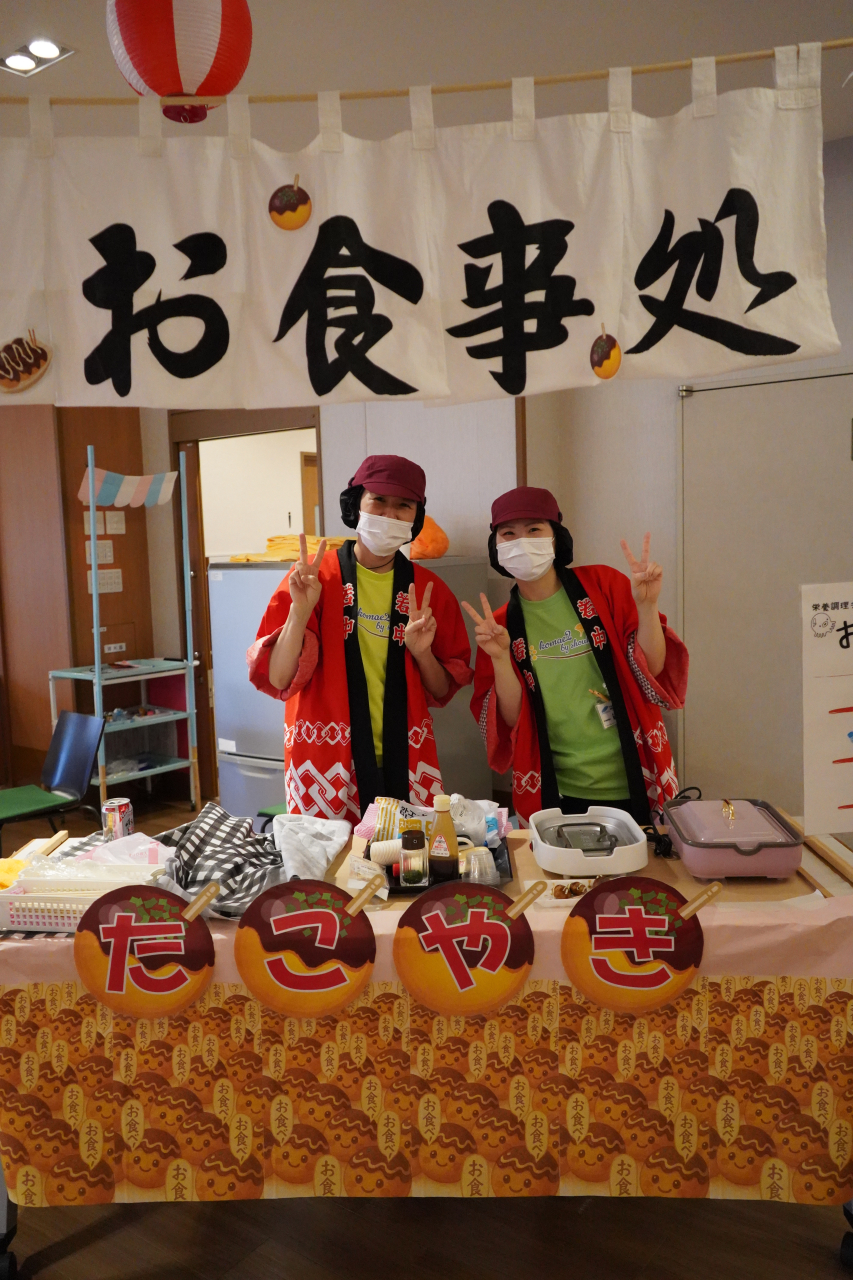 昨年同様、各ユニットよりブースを出店し1階フロアは縁日ストリートと屋台コーナーでお祭り会場に変身。ご利用者が非日常のひと時を楽しく笑顔になるようにと職員がアイデアを出し合い尽力した結果、60件106名のご家族も参加され盛大に開催することが出来ました。