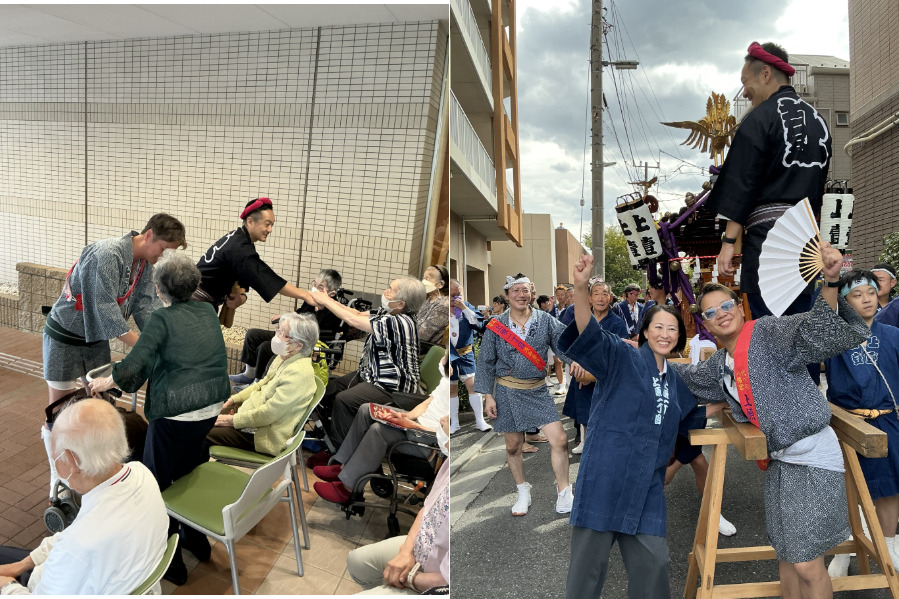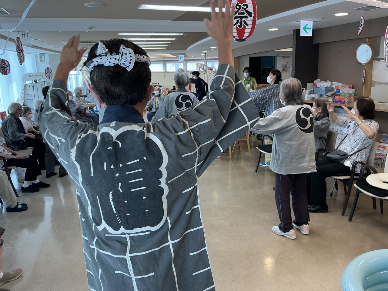 祭り半纏で踊る職員、昔取った杵柄で音頭を取るご利用者さま、