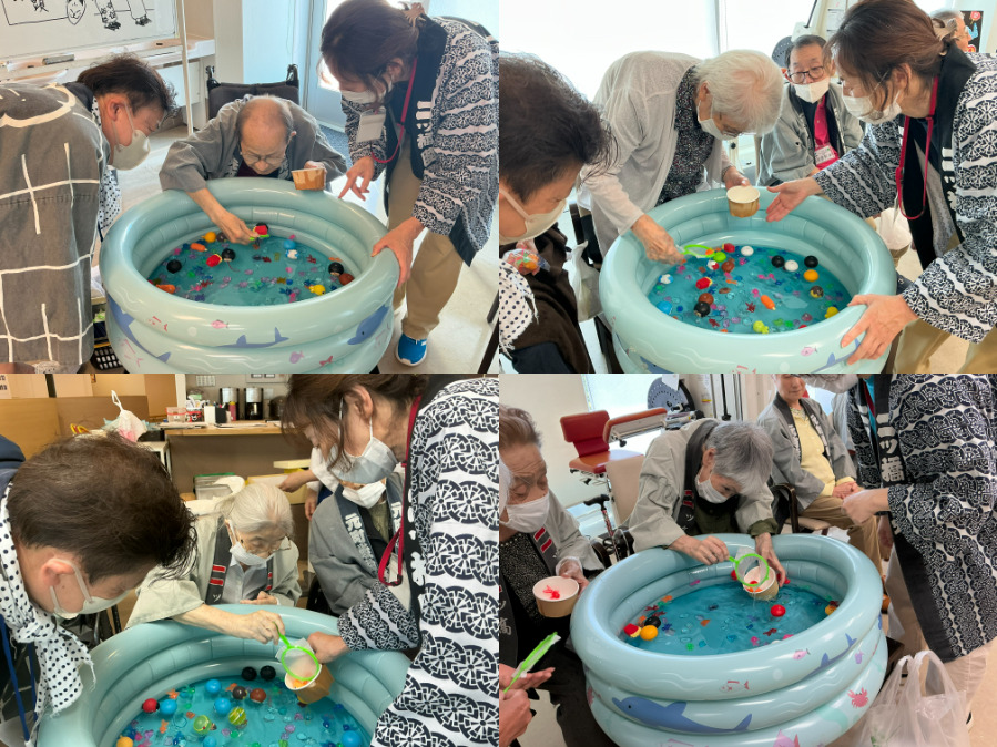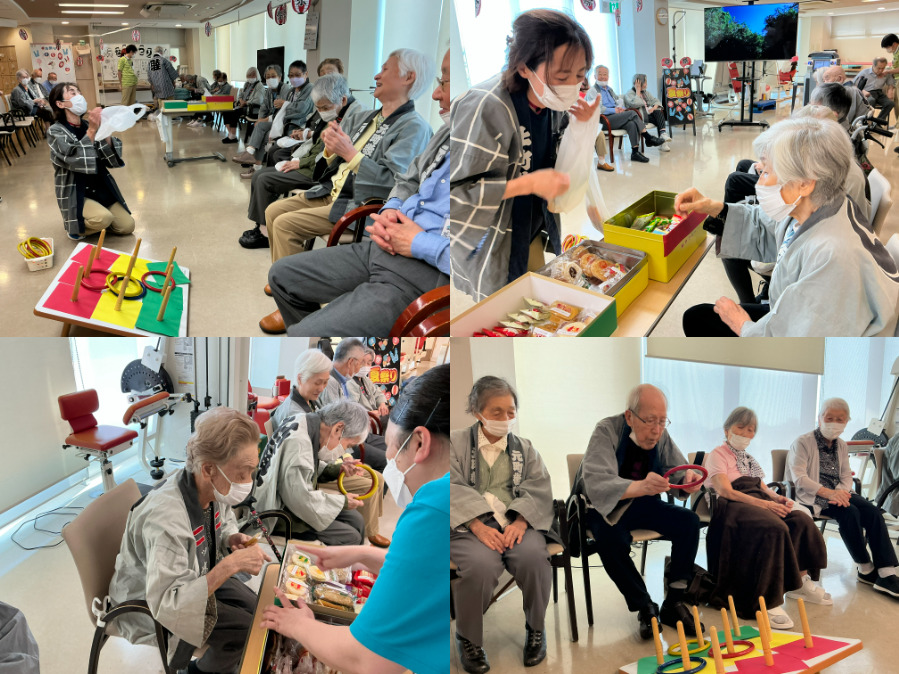 お祭りといえばテキ屋の夜店。童心に戻って楽しんでもらおうと、輪投げとおもちゃ掬いを祭り半纏姿の職員がおもてなし。