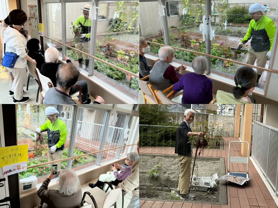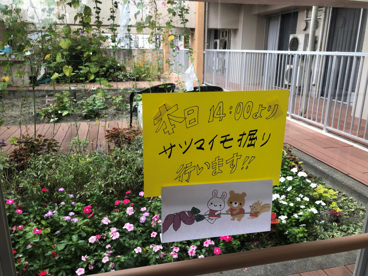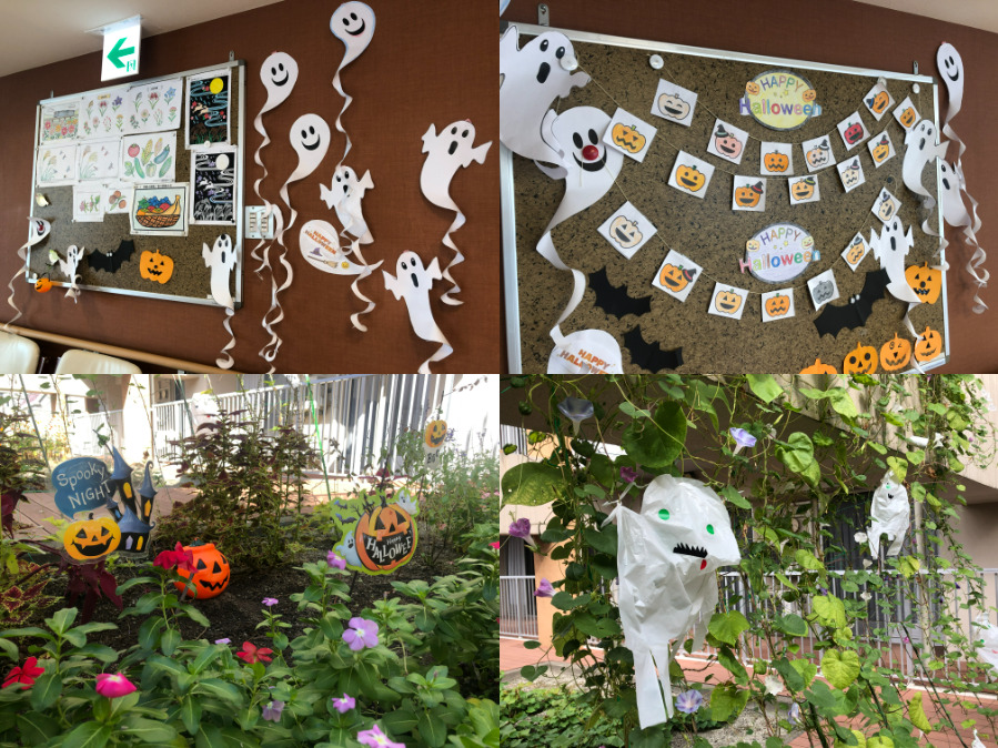 デイサービスでもおイモ掘りの時期には廊下やイモ畑の隣の花壇を、ご利用者さまにもお手伝いいただいた飾りなどでディスプレイしています。