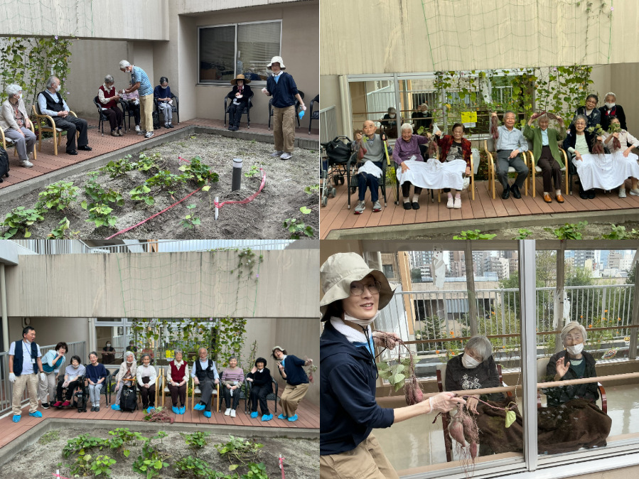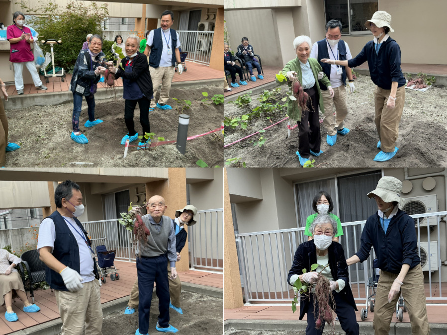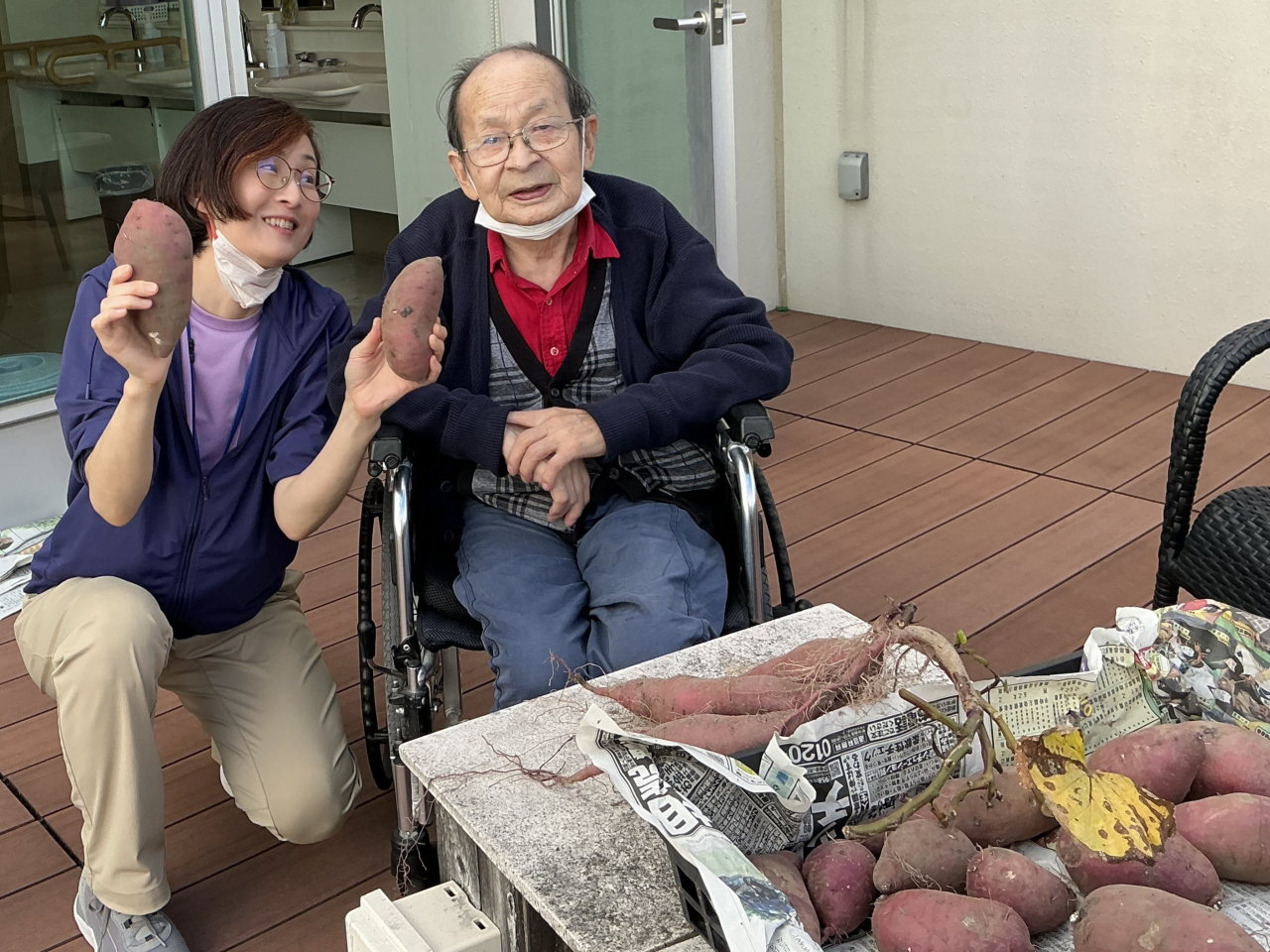 ご利用者さまには手ずから掘っていただき、秋の実りを実感してもらえました。車椅子の方や畑に出られない方にも膝の重さで実りを体感してもらえました。