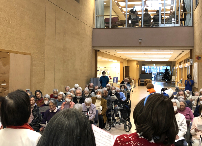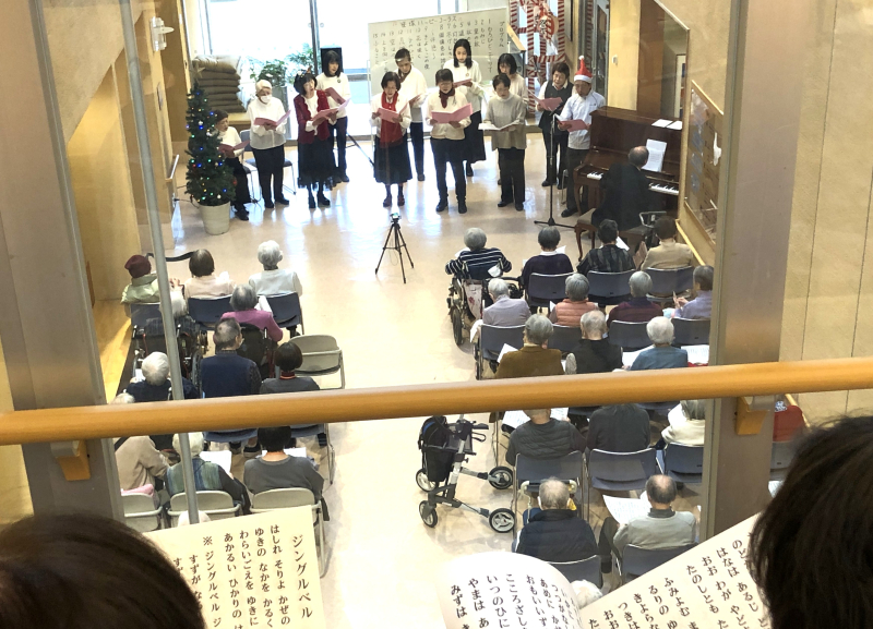 12月13日、きたざわ苑では吹き抜けのホールにて笹塚ハッピーコーラスの皆さまをお迎えし、クリスマスムードいっぱいの演奏会が開催されました。