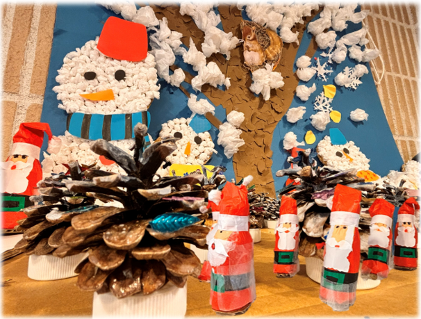 冬らしく松ぼっくりでツリー飾りの制作、雪やオーナメントをちりばめます。✨