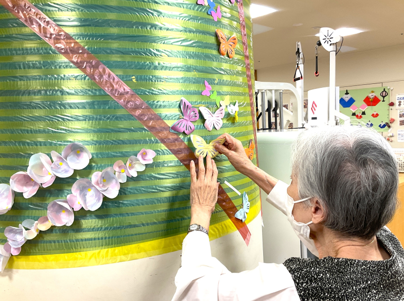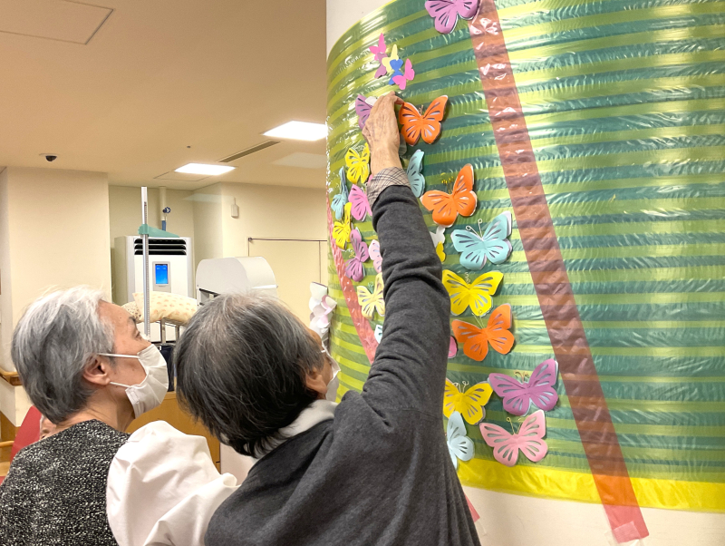 今月は、季節を感じていただける壁面飾りとして「ちょうちょ」と「お花」を制作しました。